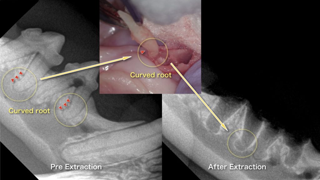 コ メ ン ト | 過去に1本抜歯をしたことのある猫でした。まだ若齢にも関わらず来院時における身体検査にて重度の歯肉口内炎(Gingivostomatitis)を起こしていました。また、右上顎第一切歯(incisor:101)の欠歯(missing tooth)、同上第三切歯(103)の歯周病(Periodontitis)、特に歯肉から歯槽粘膜、頬粘膜にかけて炎症が広がっており粘膜が酷く腫れ充血しており、出血を伴っていました。歯肉からの出血により歯周病菌はものすごく増殖する為、さらに炎症をおこし口腔内の衛生状態が著しく悪くなっていました。尾側粘膜物における口内炎(Caudal stomatitis)も呈していました。 急性期であれば抗生剤が有効ですが、慢性期に入ると症状の緩和は得られると思いますが、原因を治しているわけではないのであくまで姑息的(一時的な間に合わせ)な治療になります。今回の場合、この状態でも食欲があったことから原因となっている臼歯(malor)を抜歯する事で歯肉口内炎に対する治療が有効と考えました。ただ、角化歯肉~歯槽粘膜にいたる広範囲な炎症があった為、臼歯部の破歯細胞性吸収病巣(歯質が溶けてしまう状態)も呈している可能がありました。 動物の場合、意識下で評価は難しい為、確定診断は全身麻酔下での口腔内検査とレントゲン検査になります。 今回の症例では、レントゲン検査にて101は欠歯ではなく、歯根破折(Fractured tooth)であることが判明し、左下顎後臼歯の遠心根(一番奥歯の喉側の根っこ)で強い骨の外部または内部吸収(Resorption)が発生していました。そして、右下顎前臼歯(犬歯の後ろにある歯)の根分岐部(歯の股の所)における骨吸収も認められました。また、下顎の臼歯の歯根が湾曲(Curved roots)しており難抜歯の可能性が示唆されました。 手術時間は長くなってしまいましたが、幸いにも残根なく全ての臼歯(13本)を抜歯することができました。通常の歯根ではあればもっと早く抜歯できたはずが、湾曲歯根のため通常抜歯と比べ数倍の時間を要した。また、尾側口内炎を伴っている場合は、残根は症状の改善によい影響を与えない為、骨性癒着や骨吸収により完全に抜歯が出来ない場合を除き、すべて抜歯する必要があります。その為、残根確認のためにレントゲン検査を区域抜歯毎に撮影をしていました。 |