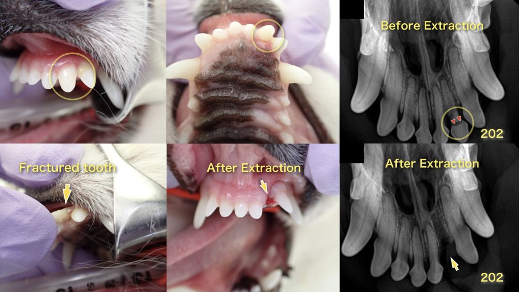 | コ メ ン ト | 当院ではどんな主訴であっても、可能な限り(怒ってみれない場合を除く)全身の身体検査を実施しています。その中には、殆どの動物病院では確認されない口腔内も含まれます。患者はワクチンを主訴に来院され、接種前の身体検査にて右上顎第四前臼歯(108)の歯冠破折(Tooth crown fracture)が起きているのが分かり、飼主様へインフォームしました。歯石もついている状態であり、破折が広範囲に及んでいる事から温存が可能かの判断は、麻酔下でのレントゲン検査、ならびに破折深度確認が必要な状況でした。もし、破折が根分岐部を超えて歯根まで至っていた場合は、抜歯が選択されます。歯内治療を行い、歯を温存することは可能ですが、正常な歯の構造が壊れている状態のため、歯と歯肉の接着が正常に機能できない事から歯周病のコントロールが非常に難しく、維持をするためには年に1-2回以上の麻酔下での処置が必要となります。それを怠れば、歯周病が進行し、抜歯になる可能性があります。 今回、麻酔下でのレントゲン検査にて、106の残根(Root stump)、遠心根の根尖部吸収病変(Apical lesions)が確認され、根分岐部(Furcation involvement)周辺の骨密度の低下も認められました。また、身体検査にて発見できなかった切歯(202)の歯根破折も確認されました。この事から、日常的に硬いものを噛んでいたり、切歯に強い力がかかっていた事が示唆されました。 手術にて破折した破折片を除去した所、破折が根分岐部を超えて両側の歯根中部にまで及んでいました。また、分岐部の骨吸収も起きており、髄室(Pulp chamber)や根管(Root canal)も見えている状況から温存することが出来ないと判断し、抜歯を行うことになりました。遠心根(Distal root)と近心頬側根(Mesiobuccal root)の根尖部には肉芽腫形成(Periapical granuloma)が起きており、長期間の歯髄感染が起きていた事も判明しました。 |